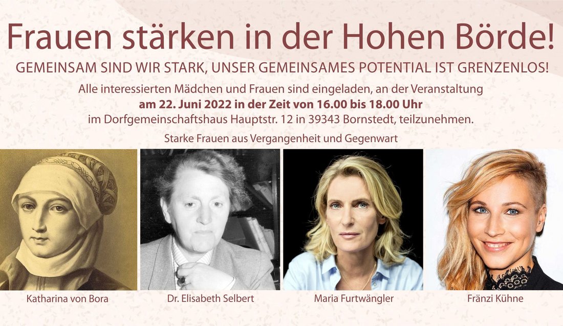 „Frauen stärken in der Hohen Börde! Gemeinsam sind wir stark, unser Potential ist grenzenlos!“ ist eine Initiative überschrieben, deren Auftaktveranstaltung am Mittwoch, dem 22. Juni, um 16 Uhr im Bornstedter Dorfgemeinschaftshaus beginnt.