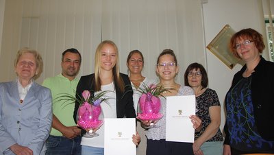 Pia Klemmstein und Marie Frank haben ihre Ausbildung zu Verwaltungsfachangestellten in der Rathausverwaltung Hohe Börde abgeschlossen. Anlässlich der feierlichen Zeugnisübergabe gratulierten Bürgermeisterin Steffi Trittel und Leitungsvertreter der Fachämter dem Duo zur bestandenen Abschlussprüfung. Beide Absolventinnen werden weiterhin in der Gemeinde Hohe Börde tätig sein.
