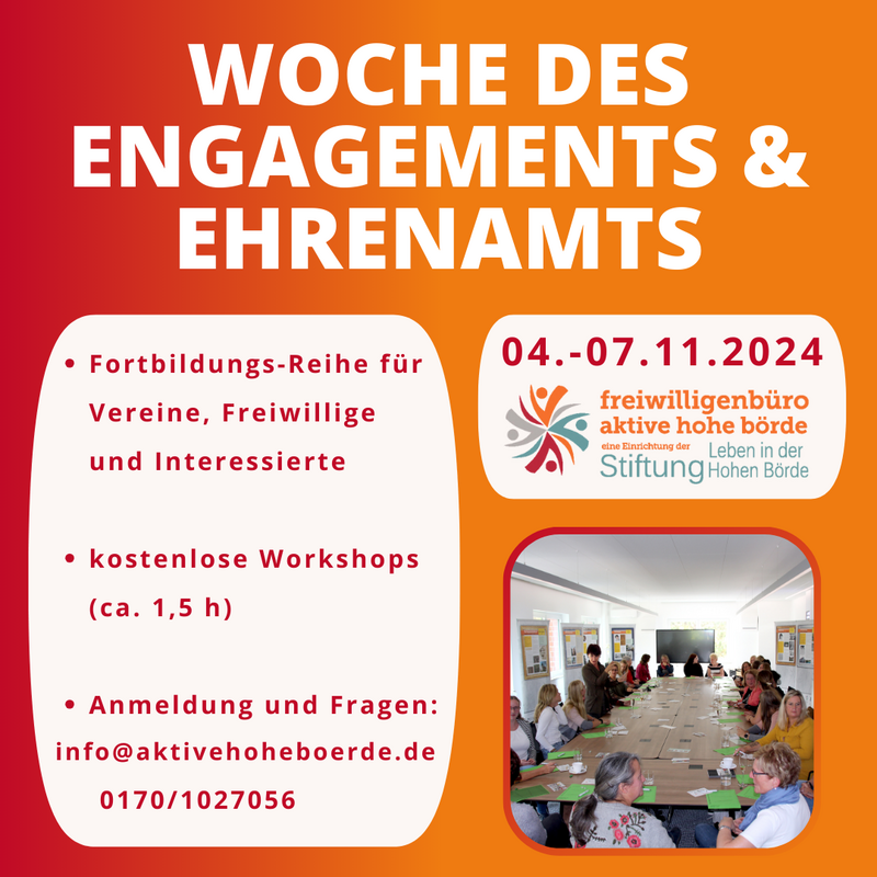 Kostenlose Fortbildungs- und Austauschmöglichkeiten für Vereine und freiwillig Engagierte bietet das Freiwligenbüro "aktive hohe börde" mit Unterstützung der Gemeinde und der Stiftung Leben in der Hohen Börde in der „Woche des Engagements“ an. Zu der Fortbildungsreihe lädt das Freiwilligenbüro vom 4. bis 7. November 2024 zum dritten Mal Vereine, Initiativen, Freiwillige und weitere Interessenten aus der Hohen Börde ein. Von Montag bis Donnerstag werden täglich Workshops (ca. 1,5 h) zu Themen angeboten, die angelehnt sind an die Wünsche der Freiwilligen und Vereine. Details zu den Angeboten können interessierte Engagierte der Übersicht übernehmen.