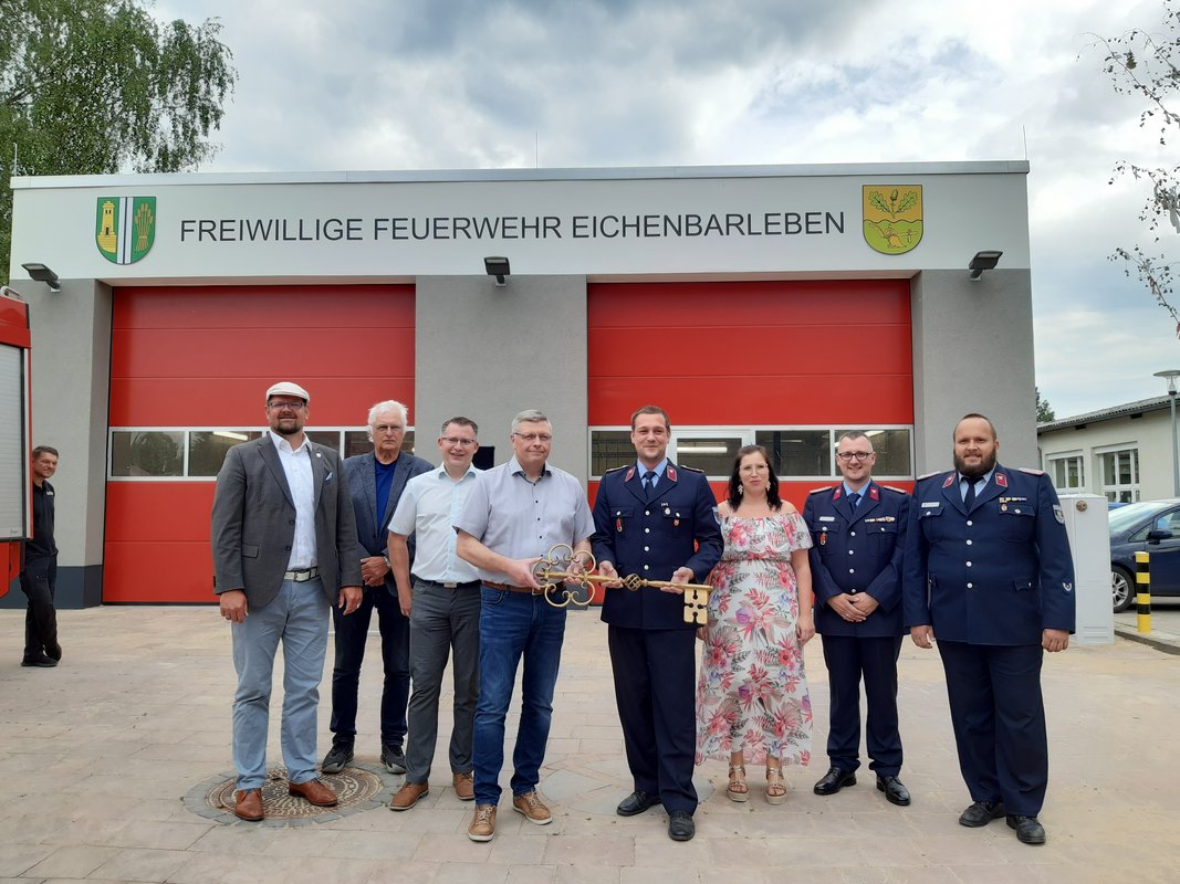 Nach knapp zehnmonatiger Bauzeit hat Gemeindebürgermeister Andreas Burger den Kameraden der Freiwilligen Feuerwehr Eichenbarleben den symbolischen Schlüssel für ihre umgebaute und erweiterte Fahrzeughalle übergeben. Somit kann die Wehr pünktlich zu ihrer „165+1-Jahr-Feier“ am Pfingstwochenende ihr neues Domizil präsentieren.