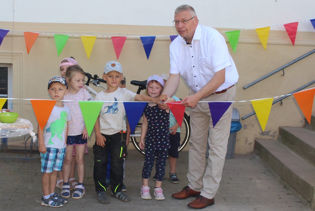 Gemeindebürgermeister Andreas Burger sah zum Abschluss der Baumaßnahme Freude bei Kindern, Erzieherinnen und Eltern. So manches Mal kam aufgrund der Verzögerungen während der Bauphase sicher der Gedanke auf, ob die Kita in Ackendorf noch eine Zukunft hat. „Die Kinder sind wieder zurück und wir hoffen, weiterhin viele Kinder hier begrüßen zu können“, erklärt Burger abschließend, bevor er gemeinsam mit dem kleinen Lio mit einem symbolischen Scherenschnitt das Gebäude offiziell freigab.