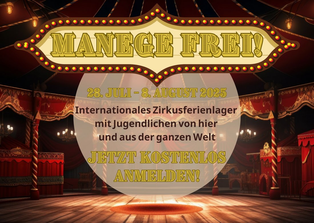 Vom 28. Juli bis zum 8. August 2025 haben insgesamt 15 junge Menschen aus der Börde im Alter von 15 bis 26 Jahren die Möglichkeit, sich bei „ZIRKUS – Manege frei!“ auszuprobieren. Gemeinsam mit 15 internationalen Jugendlichen, die aus der ganzen Welt einreisen werden, werden sie gemeinsam eine Zirkusshow gestalten, Kostüme basteln und Zirkustricks lernen. Das gegenseitige Kennenlernen und der Austausch stehen dabei im Vordergrund. Englischkenntnisse sind vorteilhaft, jedoch kein Muss. Das Training findet täglich für fünf Stunden in Eichenbarleben statt. Die tägliche An- und Abreise muss selbstständig erfolgen. Der Höhepunkt des Ferienlagers ist ein öffentlicher Auftritt mit anschließender gemeinsamer Abschlussfeier.