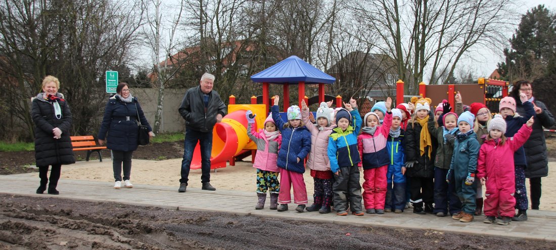 Den Spielplatz im neuen Wohngebiet „Am Pappelwald“ in Hermsdorf eröffneten die Kinder der Kita „Abenteuerland“ am 14. Januar zusammen mit Bürgermeisterin Steffi Trittel und Ortsbürgermeister Dieter Dähnhardt.