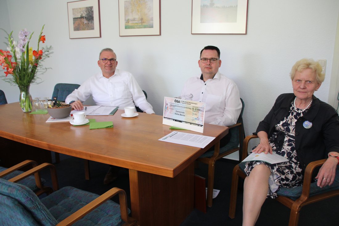 Die Öffentlichen Versicherungen Sachsen-Anhalt (ÖSA) honorieren die versicherte Gemeinde Hohe Börde mit einer finanziellen Zuwendung. Grund ist der 2021 gering gehaltene Schadensaufwand der Gemeinde Hohe Börde. Den Scheck über 2.980 Euro nahm Bürgermeisterin Steffi Trittel am 10. August von ÖSA-Agenturleiter Sebastian Wieland und Frank Meyer, ÖSA-Abteilungsdirektor Kommunen und Wohnungswirtschaft, entgegen.