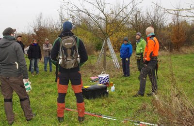 Anderthalb Stunden Theorie - mit Ausflügen in die Geschichte der Streuobstwiese, mit Details über das Wachstum eines Baumes und seinen Beschnitt in den Wachstumsphasen – standen am Anfang. Unterschiede von Winter- und Sommerschnitt, vielfältige Schnitt-Techniken und das dafür passende Werkzeug ergänzten die Einführung.