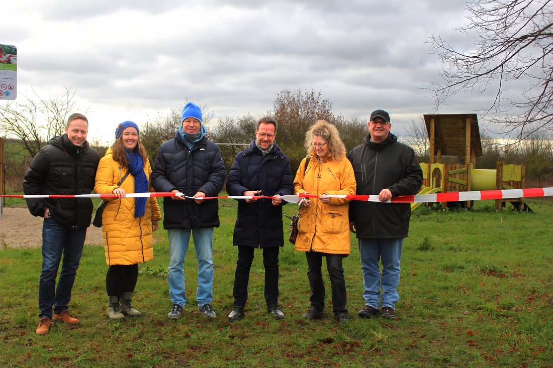 Mit einem symbolischen Banddurchschnitt ist am Nikolaustag ein kleiner Spielplatz unterhalb des Wohngebietes „Am Park“ in Irxleben seiner Bestimmung übergeben worden. Drei Spielgeräte laden hier jetzt zum Spielen ein. Sie entsprechen dem Wunsch, den die Ortschaft Irxleben und die Gemeinde Hohe Börde, in Verbindung mit der Aufstellung des Bebauungsplans für das neue Baugebiet „Am Sportplatz“ (Fuchstal) formuliert hatten.