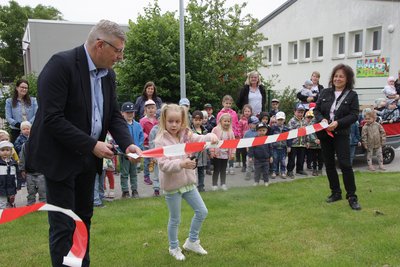 Gemeindebürgermeister Andreas Burger unterstrich vor dem feierlichen Scherenschnitt: „Unsere neue Spielfläche ist ein Ort voller Spaß, Abenteuer und gemeinsamer Erlebnisse. Wir wünschen den Kindern viel Freude beim Erkunden, Spielen und Entdecken. Möge dieser Platz ein Ort sein, an dem Freundschaften entstehen, Kreativität gefördert wird und jeder Tag zu einem besonderen Erlebnis wird.“ Dann eroberten die Knirpse ihr neues Reich im Sturm. Eichenbarlebens Ortsbürgermeister Dirk Preuße hatte bunte Bälle an die kreischende Meute übergeben. Das kam an.