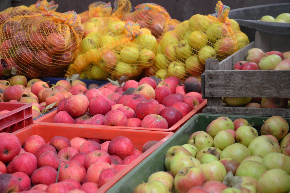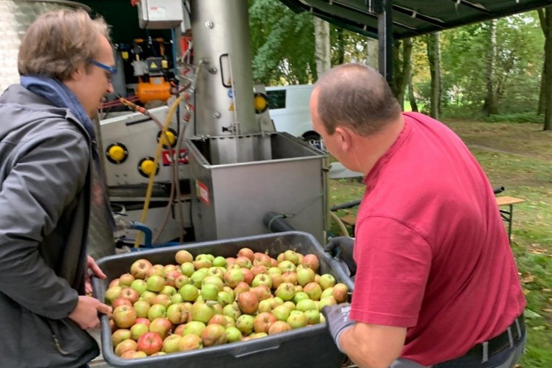 Beim Streuobstwiesenfest in Bornstedt entstanden aus zwei Tonnen handgesammelter Äpfel und Birnen leckerer Biosaft.