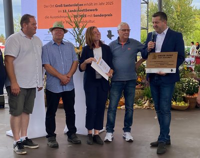 Mit Bronze sind im Rahmen des Wettbewerbs „Unser Dorf hat Zukunft“ auf Landesebene Groß Santersleben und Rottmersleben ausgezeichnet worden. Damit verbunden ist ein Preisgeld in Höhe von 1250 Euro. Da Groß Santersleben sich zudem über einen Sonderpreis „Willkommenskultur“ freuen konnte, erhöht sich das Preisgeld um weitere 500 Euro. Die Preise nahmen Vertreter beider Ortsteile auf dem Landeserntedankfest in Magdeburg entgegen.