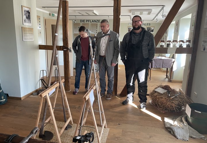 Rathausmitarbeiter Eric Körner, Groß Santerslebens Ortsbürgermeister Andreas Burger und der Rottmersleber Bierbrauer trafen sich zu einem Vorbereitungsgespräch in der Ausstellung des Hopfen-Info-Hauses. Am 6. August soll das Fest des Bieres gefeiert werden.