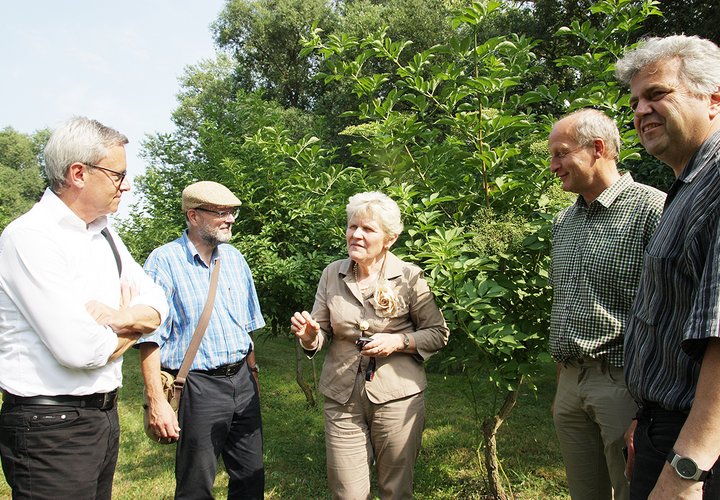 Gruppe von fünf Menschen diskutiert im Grünen.