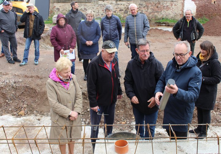 Nach dem Mehrgenerationenhaus mit Kindertagesstätte, Grundschule und Sporthalle bekommt die Neue Mitte in Hermsdorf mit einem Hortgebäude ein weiteres Element. Damit das Gebäude auch auf festem Grund errichtet werden kann, wurde am 1. November die Zeitkapsel im Grundstein versenkt.