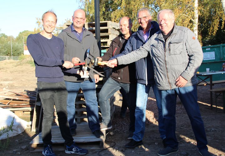René Stürmer (Vorsitzender des Gemeinderates Hohe Börde), Bauamtsleiter Rüdiger Schmidt, Ortbürgermeister Jens Göttinger, Kita-Leiter Steve Zaruba, Bürgermeisterin Steffi Trittel und Architekt Volker Seidl (von links nach rechts) versenkten die Kapsel im Grundstein der neuen Niederndodeleber Kita.